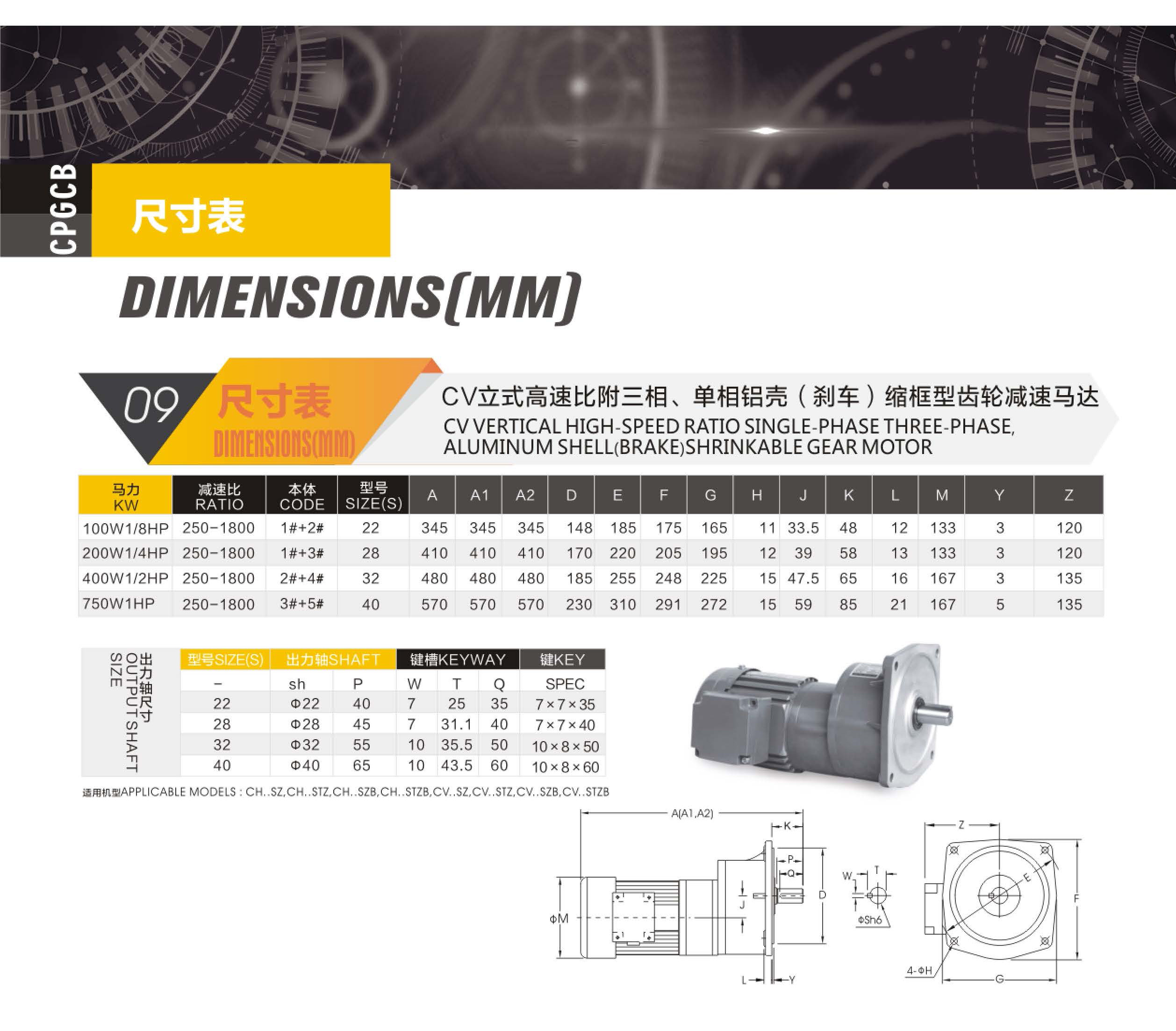CV立式高速比附三相、單相鋁殼(剎車)縮框型齒輪減速馬達
